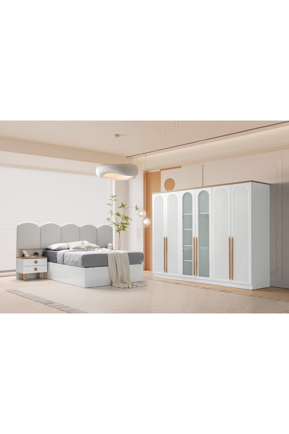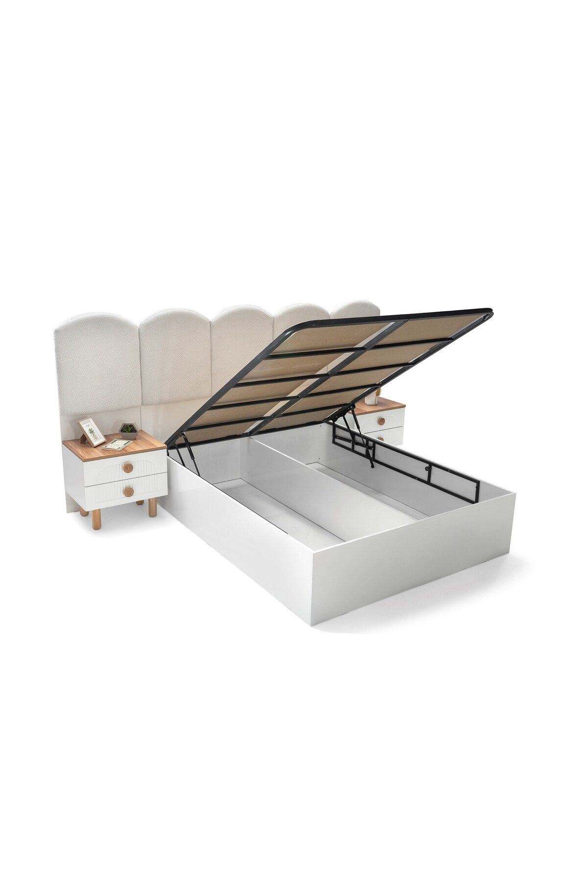 Modern tasarımıyla dikkat çeken Alya bazalı mdf yatak odası takımı, şık ve çağdaş bir görünüm sunar; Set içeriği; bazalı karyola, iki komodin, şifonyer ve gardırop olmak üzere dört parçadan oluşur, böylece yatak odanızda ihtiyacınız olan her şeyi tek bir
