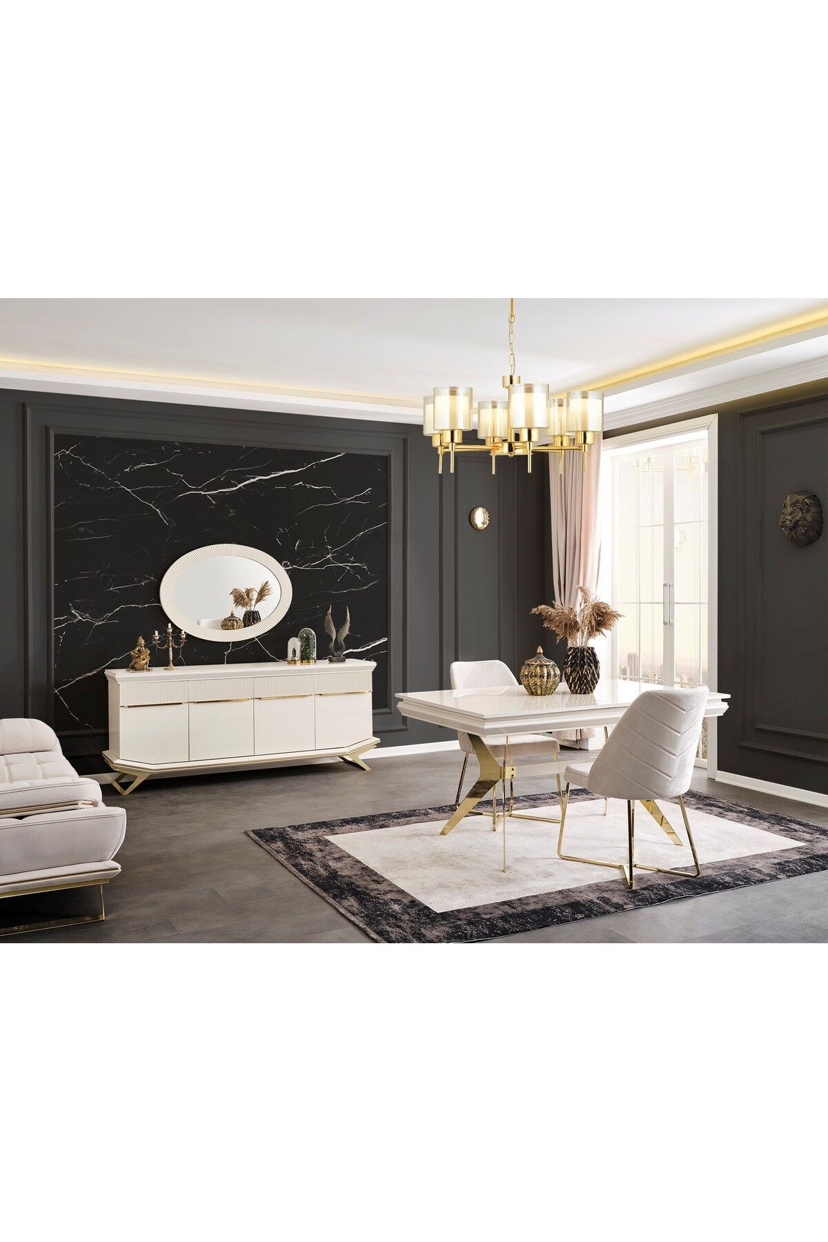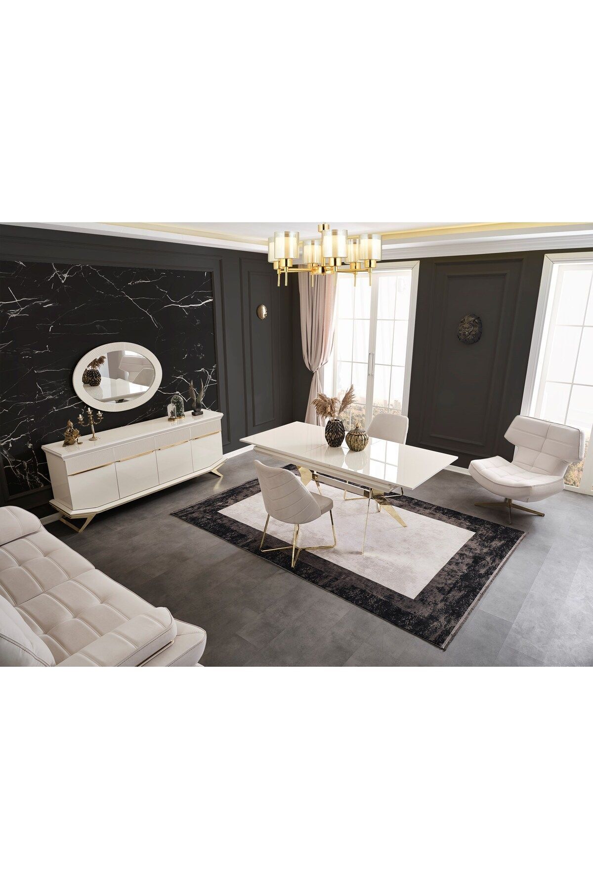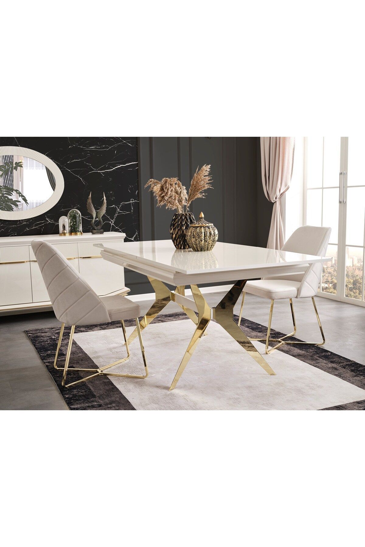 - Modern tasarımıyla dikkat çeken Angel gold yemek odası takımı, şık ve çağdaş bir görünüm sunar; - Açılır masa fonksiyonu sayesinde, ihtiyaç duyulduğunda ekstra konuklarınız için kolayca genişletilebilir ve pratik bir kullanım sağlar; - Sandalyelerde kul