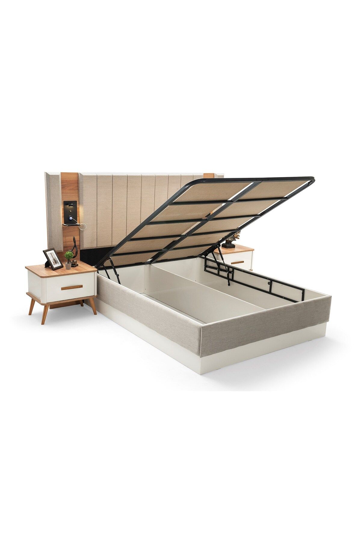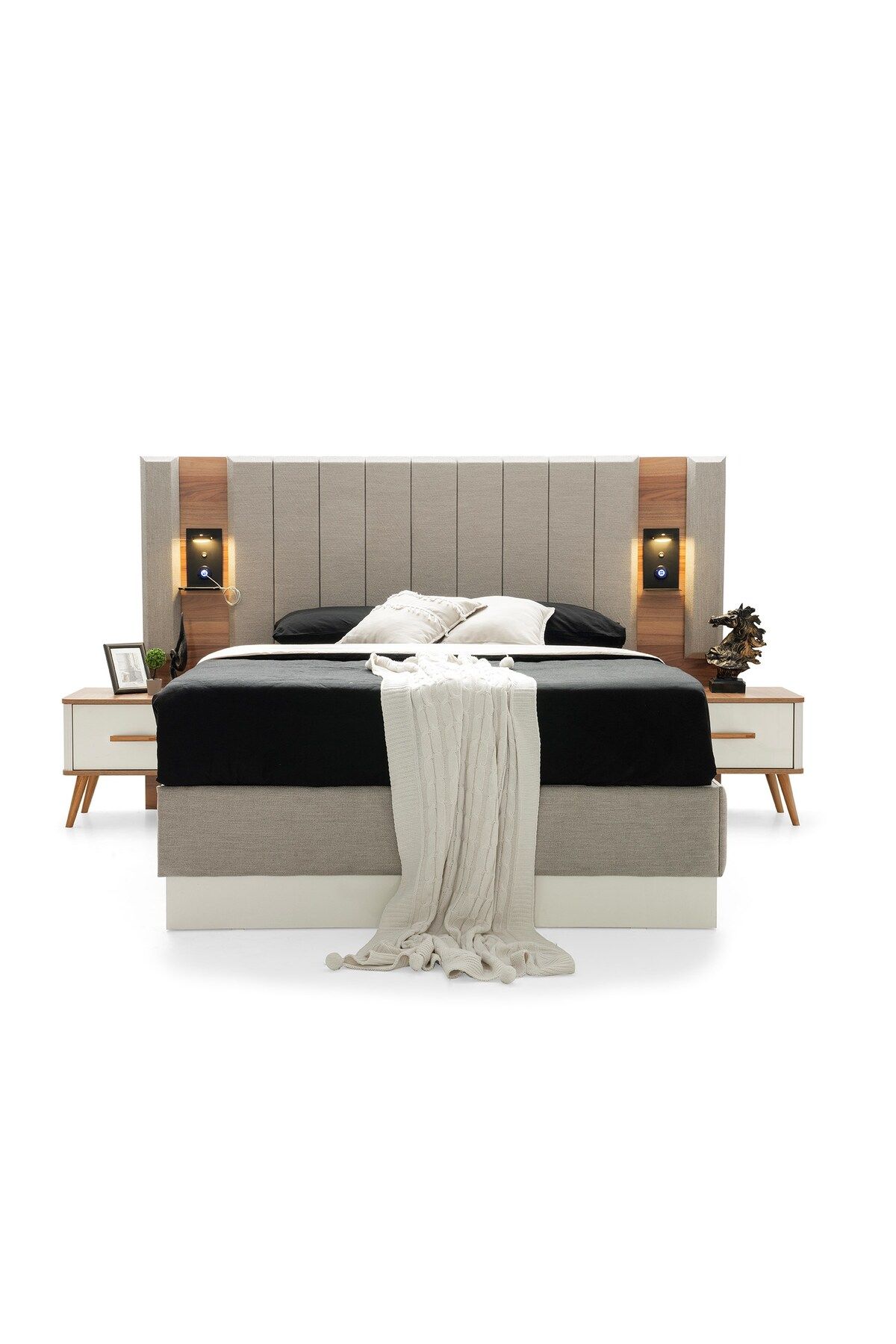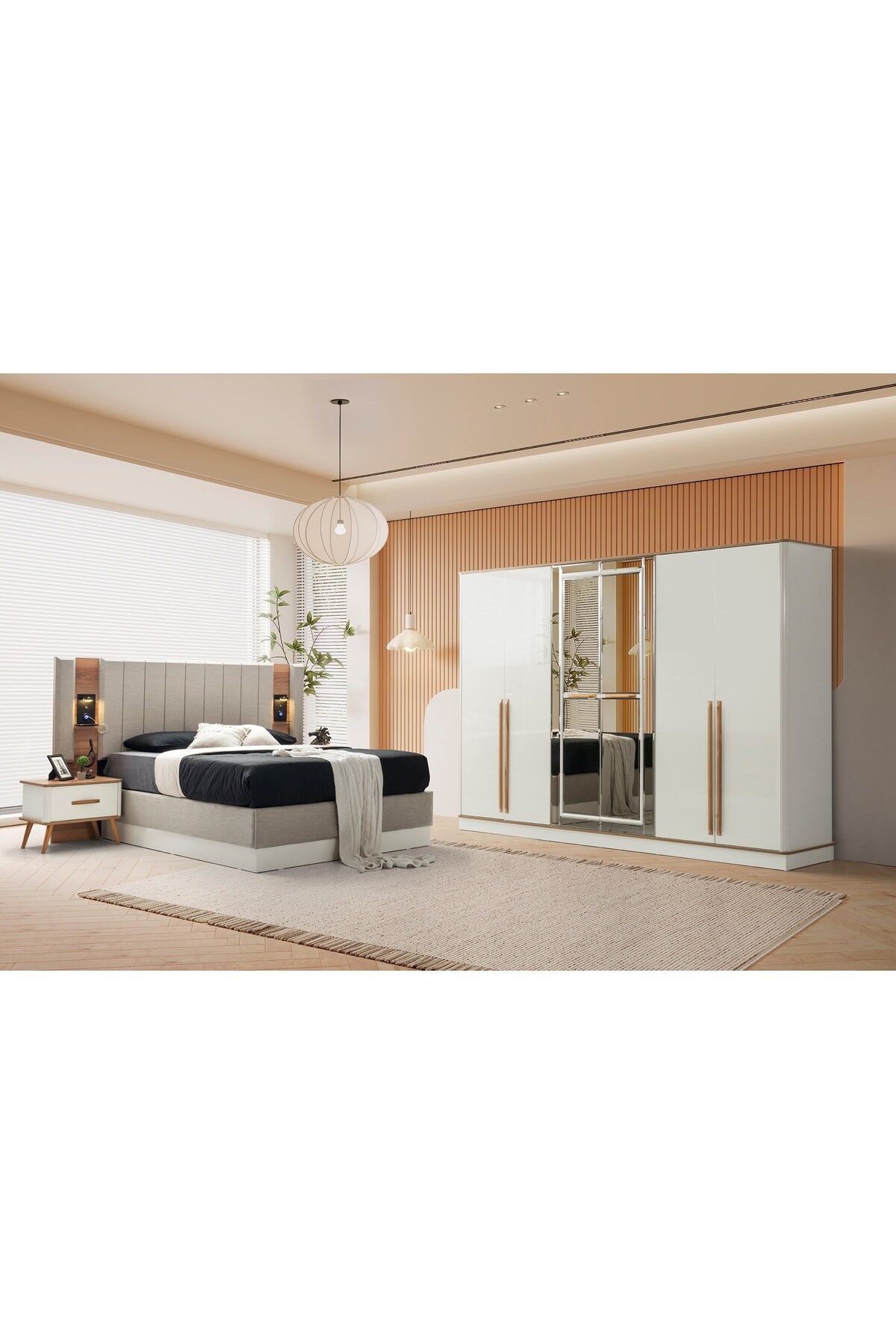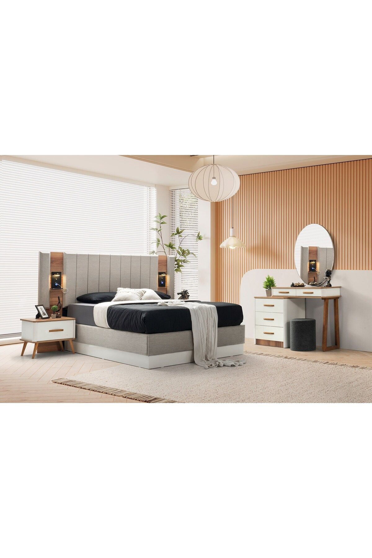 Modern tasarımıyla dikkat çeken antik mdf bazalı yatak odası takımı, şık ve çağdaş bir görünüm sunar; Set içeriği; bazalı karyola, iki komodin, şifonyer ve gardırop olmak üzere dört parçadan oluşur, böylece yatak odanızda ihtiyacınız olan her şeyi tek bir