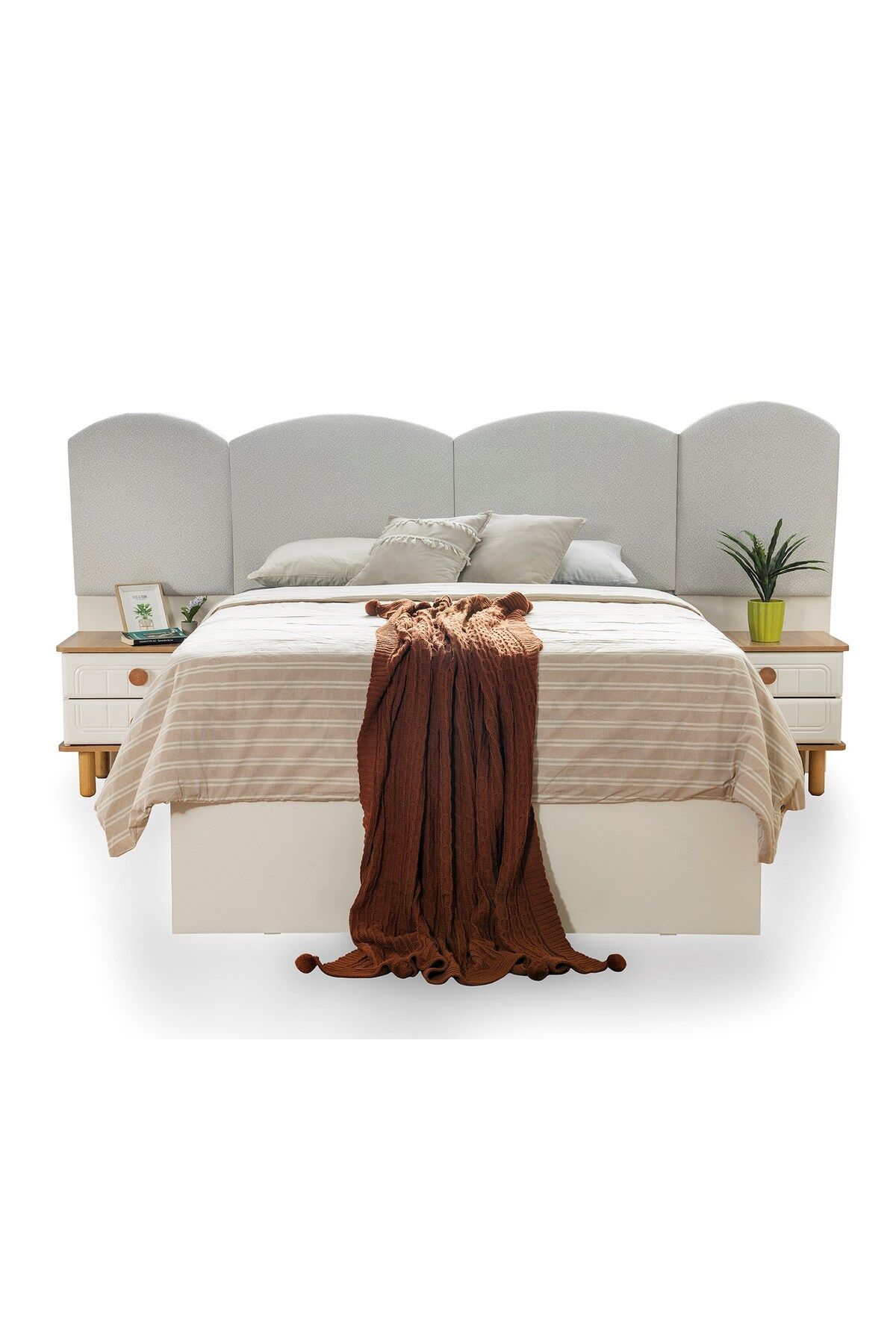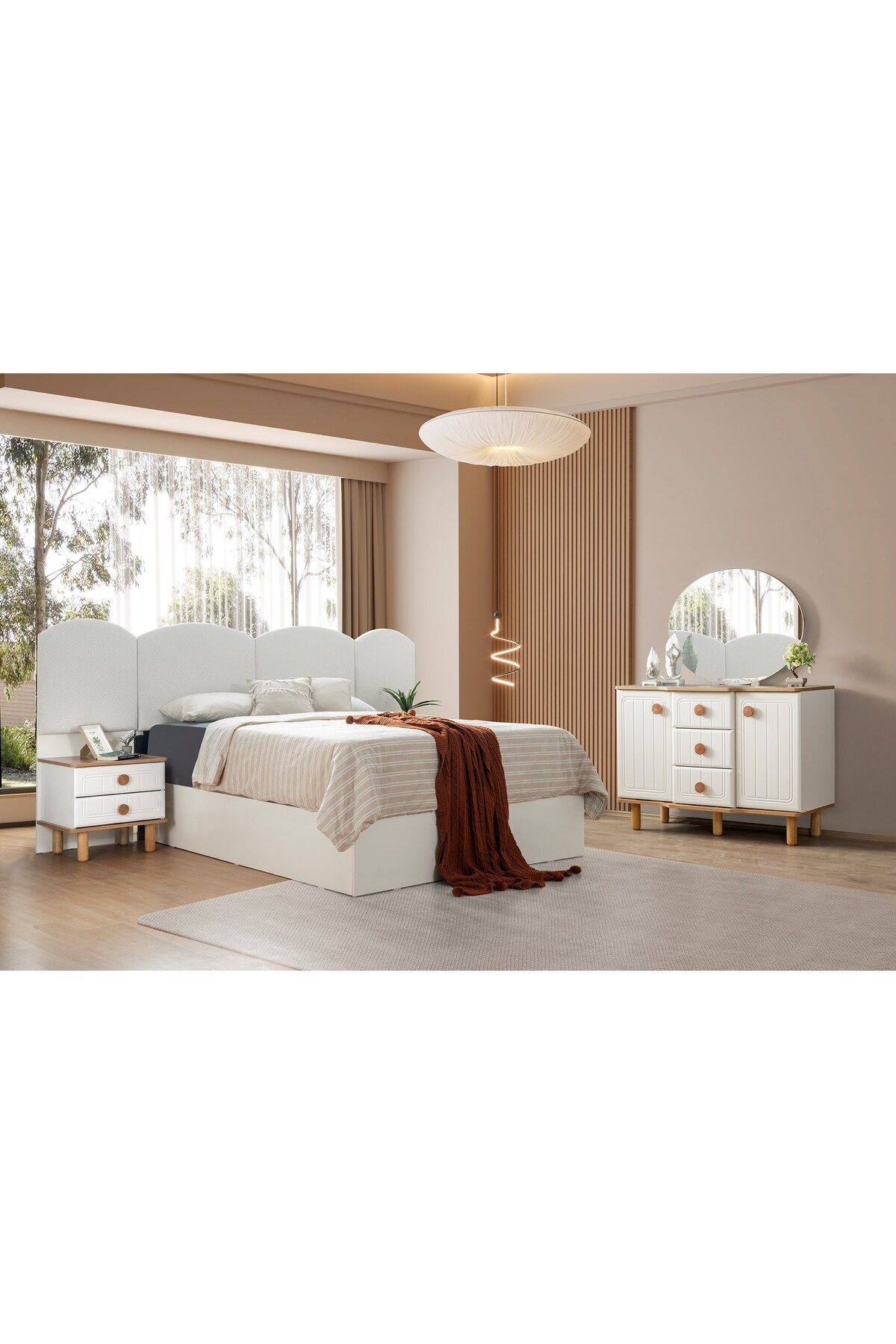 Modern tasarımıyla dikkat çeken Ayra yatak odası takımı, şık ve fonksiyonel bir yatak odası deneyimi sunar; Set içeriği; bazalı karyola, iki komodin, şifonyer ve gardırop olmak üzere dört parçadan oluşur, böylece tüm ihtiyaçlarınızı tek bir pakette karşıl