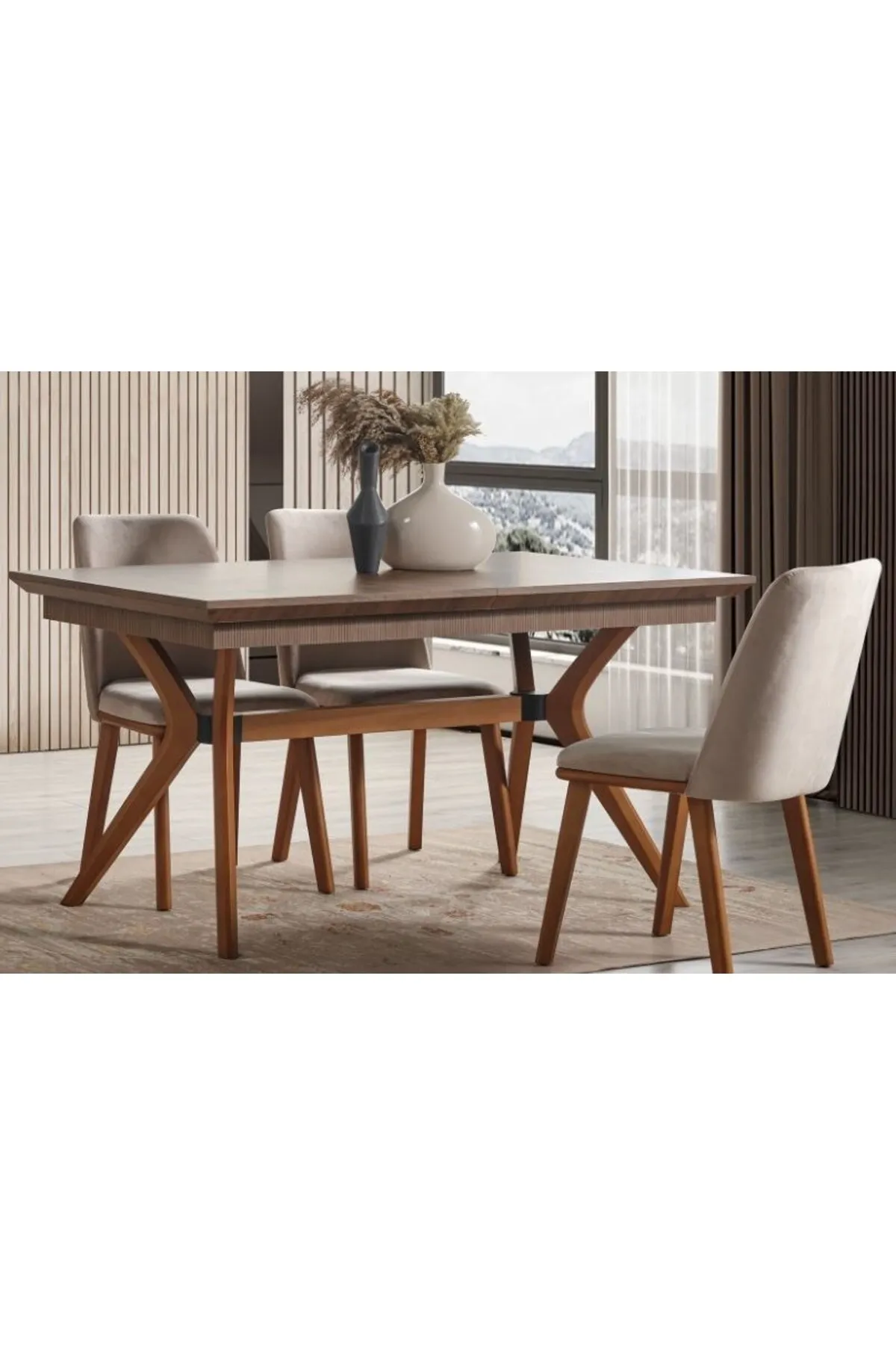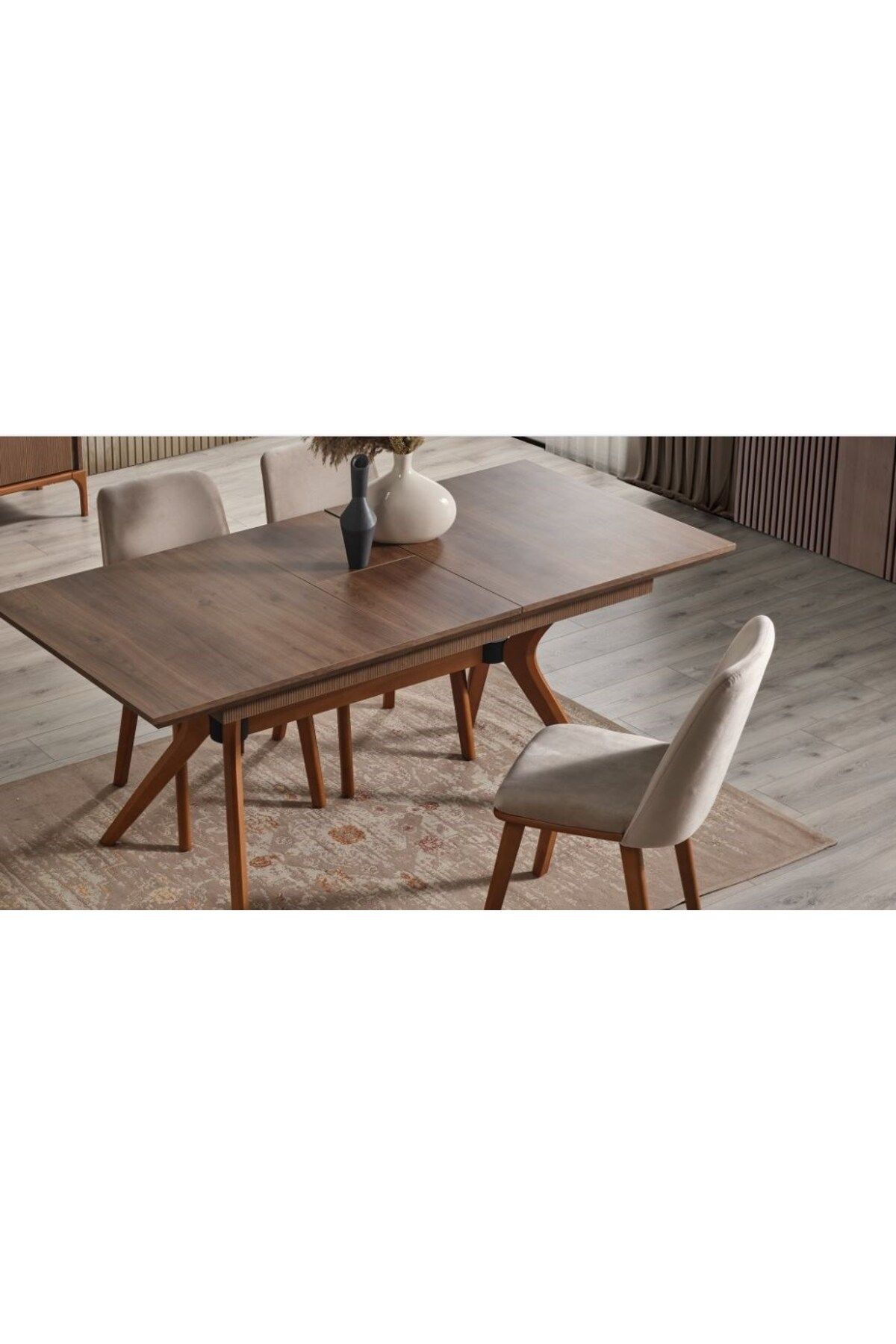 - Modern tasarımıyla dikkat çeken açılır yemek masası, şık ve fonksiyonel bir kullanım sunar; - Kadife kaplı sandalyeler, yumuşak dokusuyla konforlu bir oturma deneyimi sağlar; - Ahşap malzeme kullanımı, dayanıklılığı ve estetik görünümü bir arada sunarak