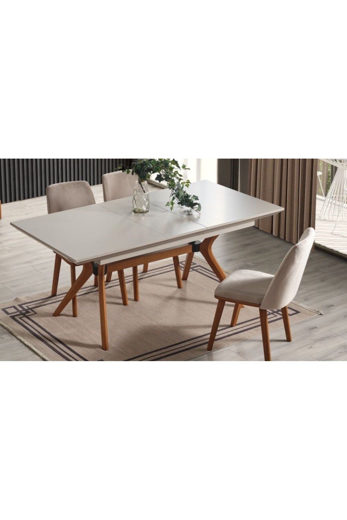 Modern tasarımı ile dikkat çeken bu yemek odası takımı, hem şık hem de işlevsel bir kullanım sunar.; Ahşap malzemesi sayesinde dayanıklı ve uzun ömürlüdür; aynı zamanda doğal bir estetik katmaktadır.; Kadife kaplı sandalyeleri konforlu oturumlar sağlar; m