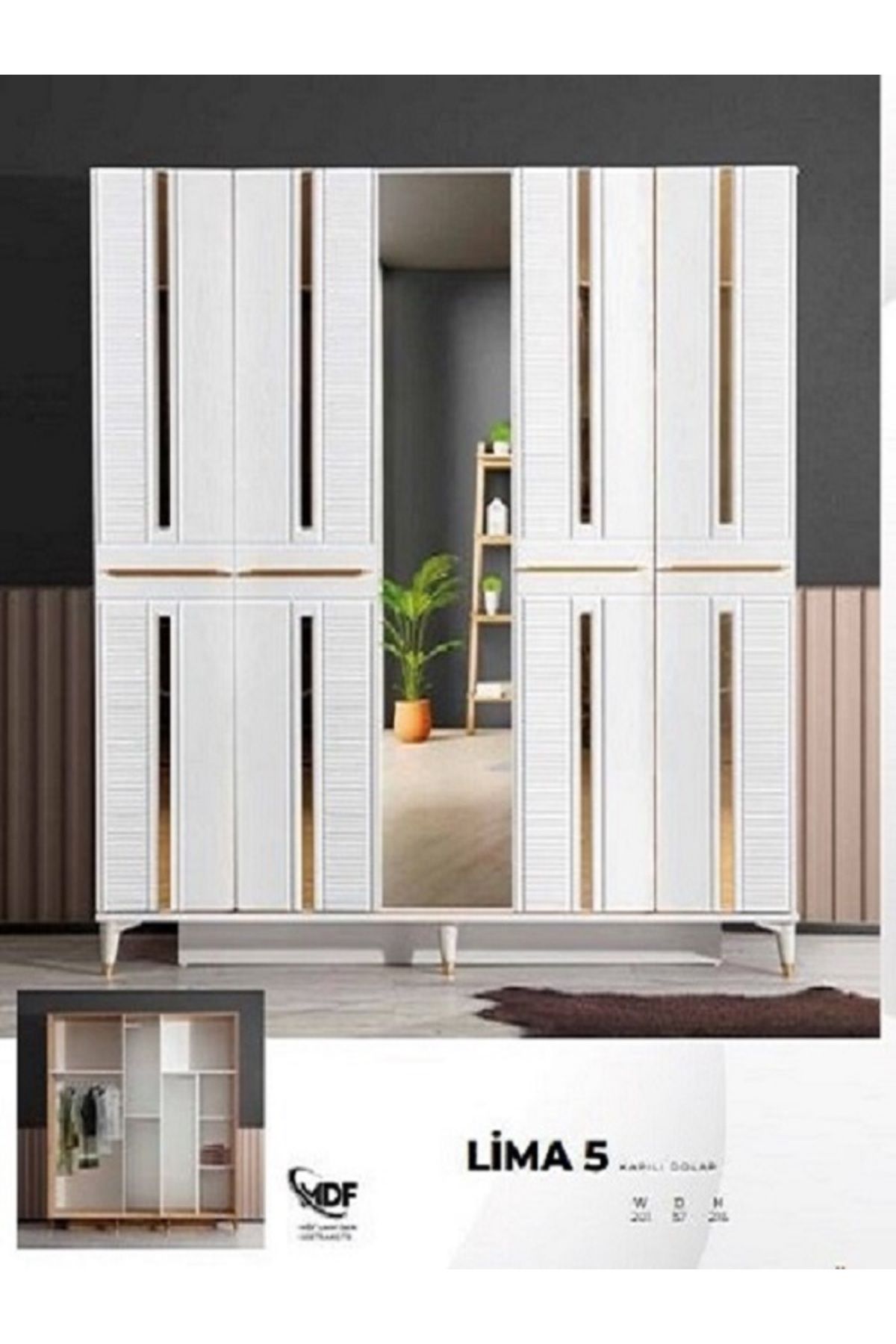 Modern tasarımıyla evinizin dekorasyonuna şıklık katan Lima mdf 5 kapılı dolap, yaşam alanlarınıza çağdaş bir hava katıyor; Kapaklı yapısı sayesinde eşyalarınızı tozdan ve dış etkenlerden korurken, düzenli bir görünüm sağlar; Aynalı kapakları sayesinde he