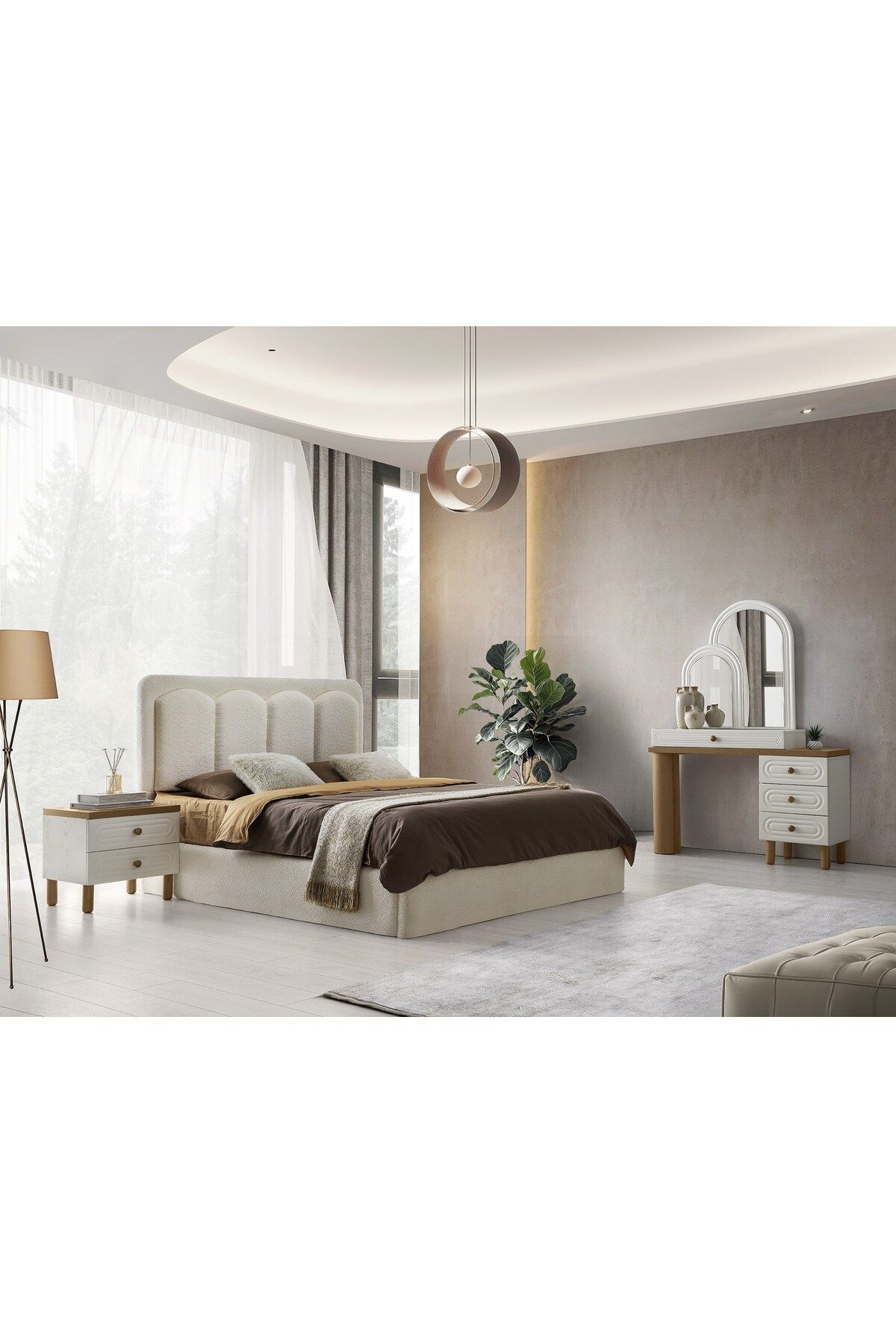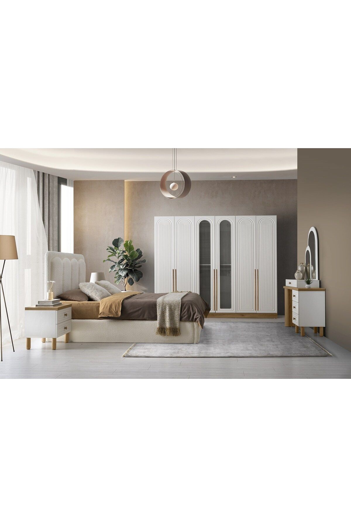 Modern tasarımıyla dikkat çeken yatak odası takımı, şık ve çağdaş bir görünüm sunar; Kapaklı dolap fonksiyonu sayesinde eşyalarınızı düzenli ve tozdan korunaklı bir şekilde saklamanızı sağlar; Set içeriği; bazalı karyola, iki komodin, şifonyer ve gardırop